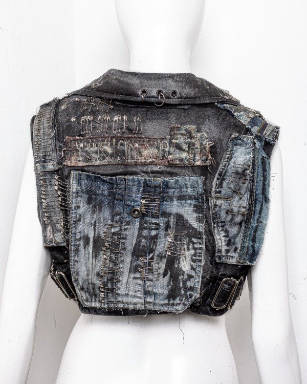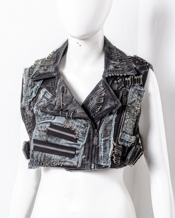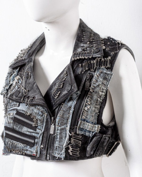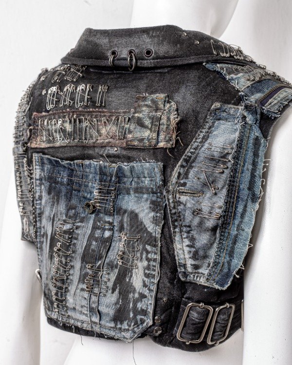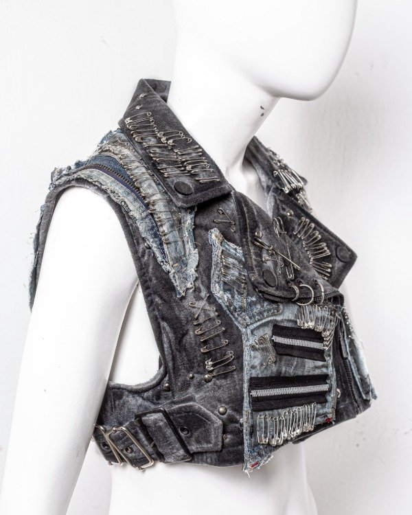 Materiales: Tela de algodon con poliester en gris, tiene forro interno en negro. Esta intervenido con color y piezas de jean. Tachas y alfileres colocados a mano.