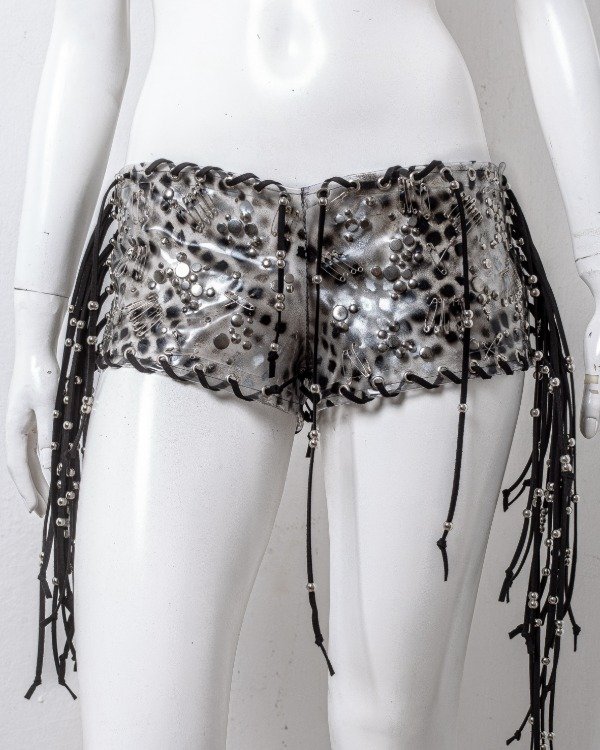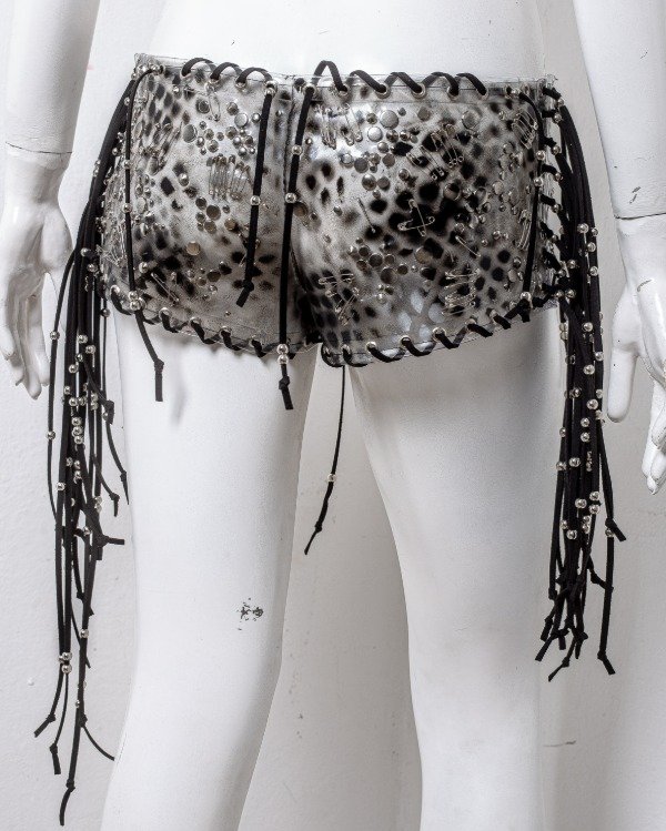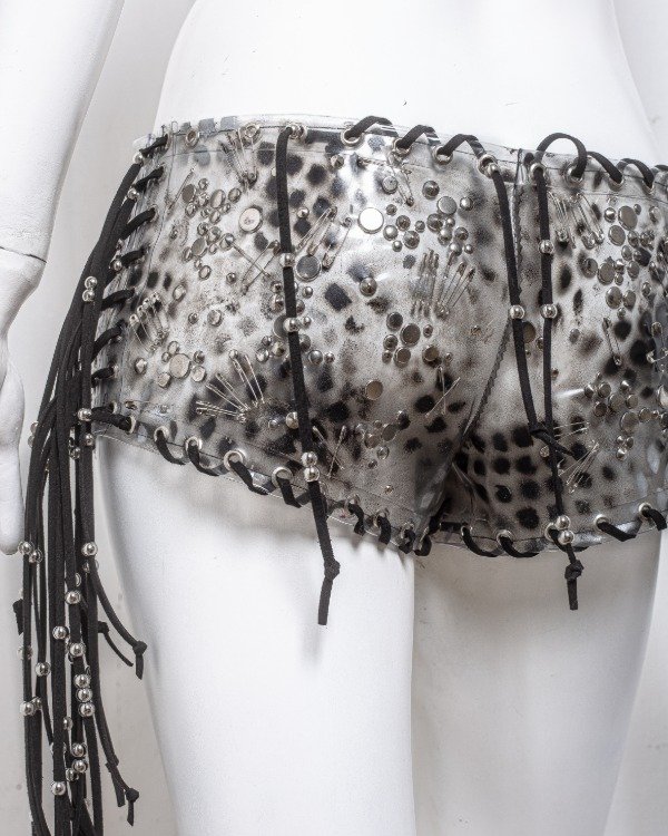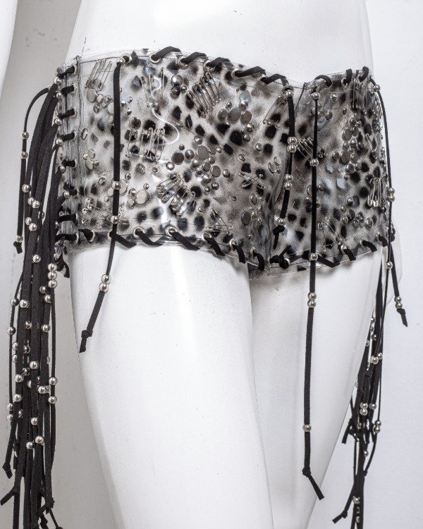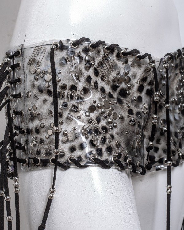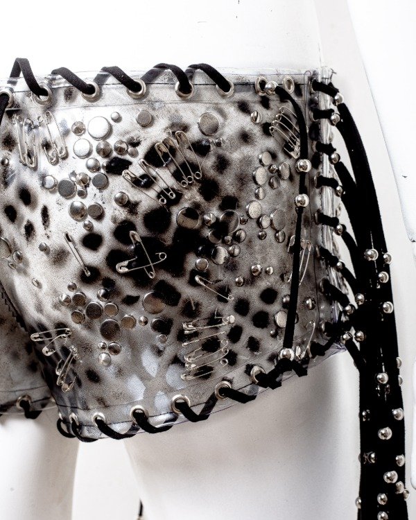 Materiales: Es de vinilo transparente con intervención en aerosol con stencil y tachas, alfileres colocados a mano. Se ata por los costados con tiras de gamuza.