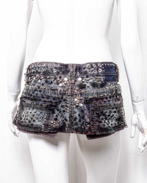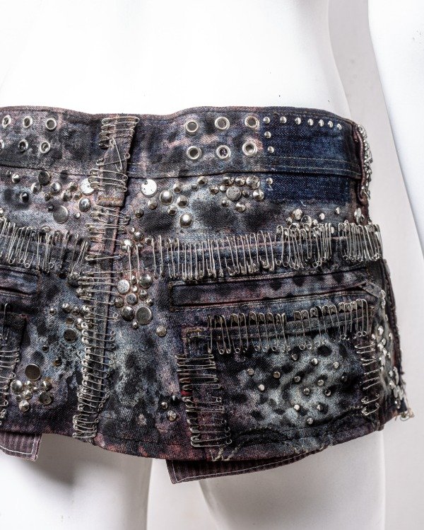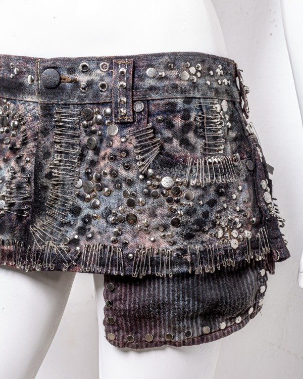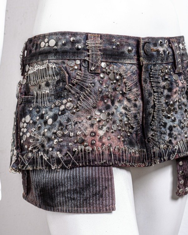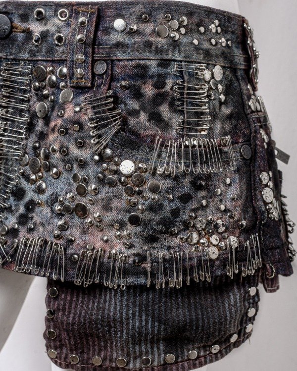 Materiales: Jean de algodon con intervencion en color, muchas tachas y alfileres colocados a manoooooooooo.