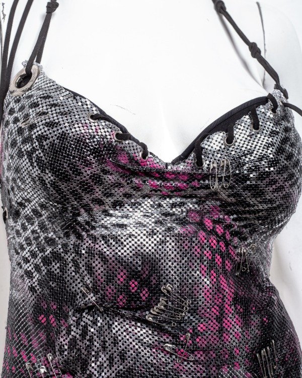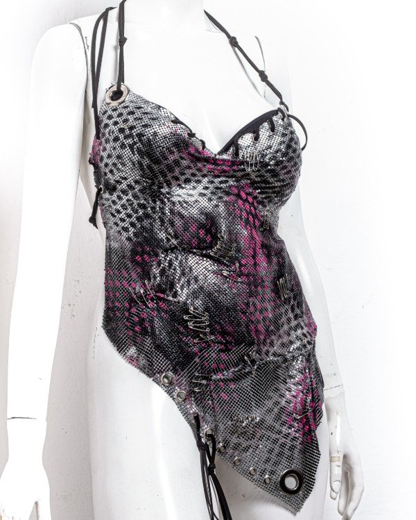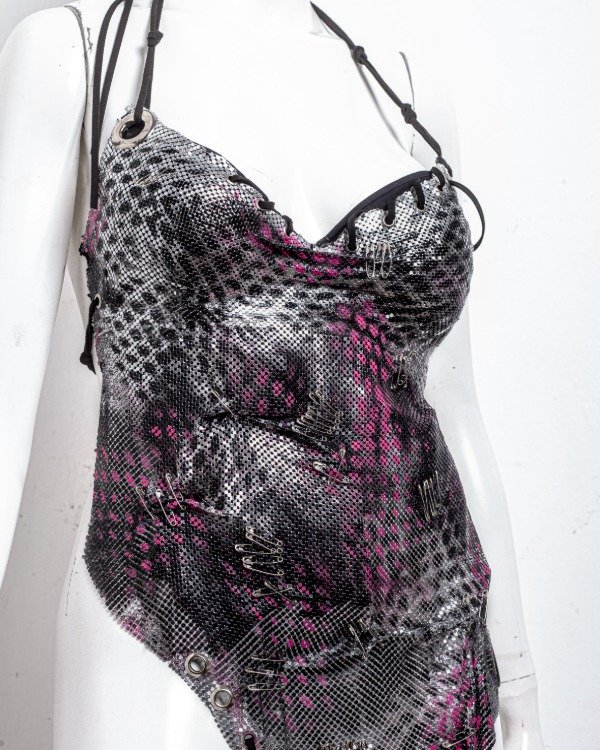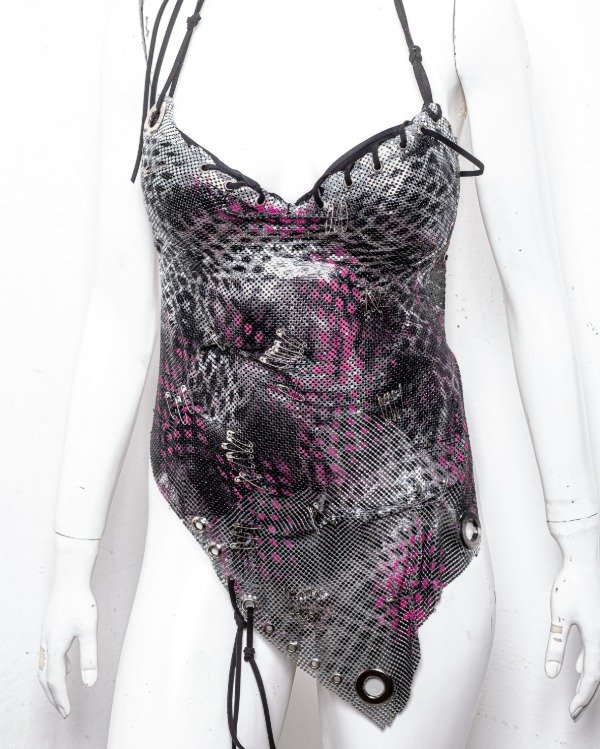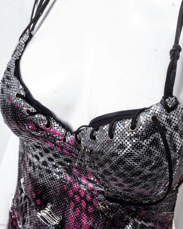 Materiales: malla metálica, en la parte del busto es rígida, tiene una base de corpiño por dentro para mas comodidad. Se ata por detrás y por el cuello con tiras de gamuza.